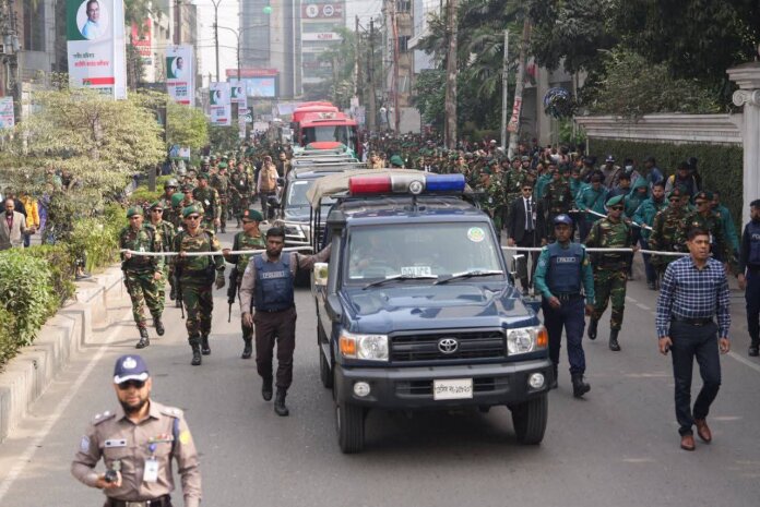 সাবেক প্রধানমন্ত্রী ও বিএনপি চেয়ারপারসন বেগম খালেদা জিয়ার মরদেহ কঠোর নিরাপত্তার মধ্য দিয়ে জাতীয় সংসদ ভবনের দক্ষিণ প্লাজায় পৌঁছেছে। লাল-সবুজ রঙের জাতীয় পতাকায় মোড়ানো একটি ফ্রিজার ভ্যানে করে মরদেহটি বহন করা হয়। রাষ্ট্রীয় প্রোটোকল অনুযায়ী সেনাবাহিনী হিউম্যান চেইন তৈরি করে মরদেহটি প্লাজায় আনে।