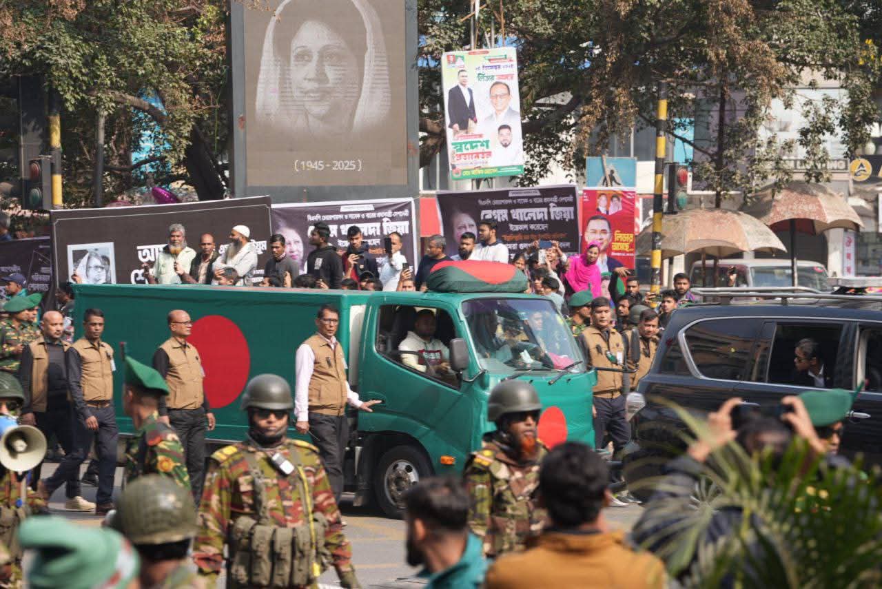 বিএনপি চেয়ারপারসন ও সাবেক প্রধানমন্ত্রী বেগম খালেদা জিয়ার মরদেহ জাতীয় পতাকায় মোড়ানো একটি গাড়িতে করে গুলশান থেকে জাতীয় সংসদের দক্ষিণ প্লাজা সংলগ্ন মানিক মিয়া অ্যাভিনিউয়ের জানাজাস্থলে নেওয়া হচ্ছে।