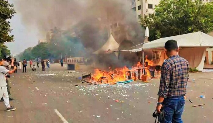 প্রত্যক্ষদর্শীদের বরাত দিয়ে জানা গেছে, দুপুর ১টার কিছু পরে আন্দোলনকারীরা পুলিশের ব্যারিকেড ভাঙার চেষ্টা করলে সংঘর্ষ শুরু হয়। তারা ব্যারিকেডে ব্যবহৃত ‘রোড ব্লকার’ একত্র করে তাতে আগুন ধরিয়ে দেন। আগুনের সূত্র ধরে সেচ ভবনের সামনে তৈরি একটি অস্থায়ী তাঁবুতে আগুন ছড়িয়ে পড়ে, যার ফলে এলাকা জুড়ে আতঙ্ক ছড়িয়ে পড়ে।