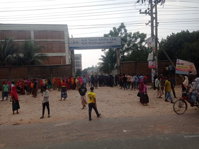 গাজীপুর প্রতিনিধি: গাজীপুরের শ্রীপুর উপজেলার জৈনাবাজার এলাকায় অবস্থিত এএ এয়ার্ন মিলস লিমিটেডের শ্রমিকরা চলতি মাসসহ দুই মাসের বকেয়া বেতন পরিশোধের দাবিতে বিক্ষোভ ও সড়ক অবরোধ করেছেন। বৃহস্পতিবার (২৩ অক্টোবর) সকাল ১০টা থেকে শ্রমিকরা কারখানার ভেতরে অবস্থান নিয়ে বিক্ষোভ শুরু করেন। পরে বেলা সোয়া ১১টার দিকে তারা ঢাকা-ময়মনসিংহ মহাসড়ক অবরোধ করলে উভয়পাশে দীর্ঘ যানজট সৃষ্টি হয়। এ সময় শ্রমিক ও পুলিশের মধ্যে সংঘর্ষের ঘটনা ঘটে, এতে নারী শ্রমিকসহ অন্তত ১০-১২ জন আহত হন। প্রায় দুই ঘণ্টা যান চলাচল বন্ধ থাকার পর পুলিশ ও সেনাবাহিনীর যৌথ প্রচেষ্টায় সোয়া ১টার দিকে পরিস্থিতি নিয়ন্ত্রণে আসে। তবে বিকেল পৌনে ৩টার দিকে শ্রমিকরা পুনরায় মহাসড়ক অবরোধের চেষ্টা করলে পুলিশ টিয়ারশেল নিক্ষেপ করে তাদের ছত্রভঙ্গ করে দেয়।