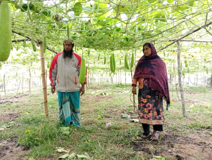 সরেজমিনে দেখা গেছে, কনকনে শীতের মধ্যেও স্বামী-স্ত্রী একসঙ্গে বাগানের পরিচর্যায় ব্যস্ত। আক্রান্ত লাউ ও শুকনো পাতা কেটে ফেলছেন, নিয়মিত জৈব সার ব্যবহার করছেন। বাঁশের মাচায় ঝুলছে ফেরোমন ফাঁদ, আর নিচে ঝুলছে শত শত লাউ।
