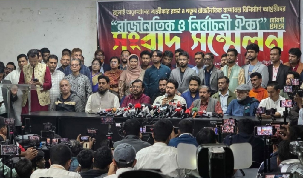 ঢাকা রিপোর্টার্স ইউনিটিতে (ডিআরইউ) রোববার বিকেল ৪টা ৫০ মিনিটে তিনটি রাজনৈতিক দল – জাতীয় নাগরিক পার্টি (এনসিপি), আমার বাংলাদেশ পার্টি (এবি পার্টি) ও বাংলাদেশ রাষ্ট্র সংস্কার আন্দোলন – একত্র হয়ে নতুন নির্বাচনী জোটের আত্মপ্রকাশ ঘোষণা করেছে।